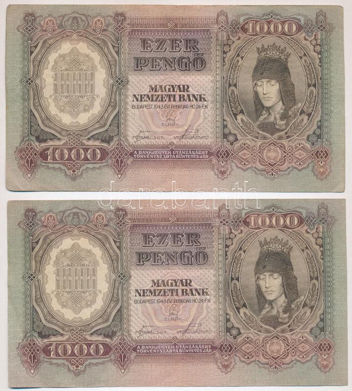 1943. 1000P (3x) T:III,III- https://www.darabanth.com/hu/283-Gyorsarveres/283.0/Numizmatika/Magyar-bankjegyek~300022/1943-1000P-3x-TIII-III-~II1467077