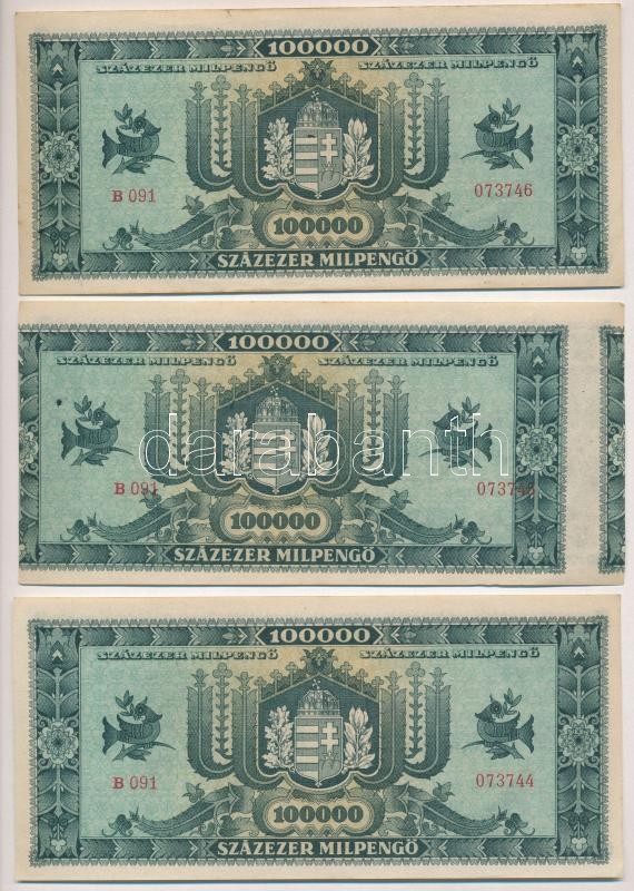 Leírás: 1946. 100.000MP (3x) sorszámkövetők, egyiken erősen balra tolódott hátlapi nyomat T:I,I-