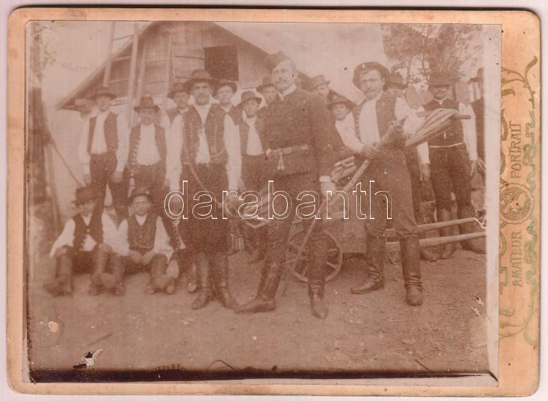 Leírás: 1906 Baráttelke, Az önkéntes tűzoltóság, csoportkép, hátoldalon feliratozva, 13x18 cm