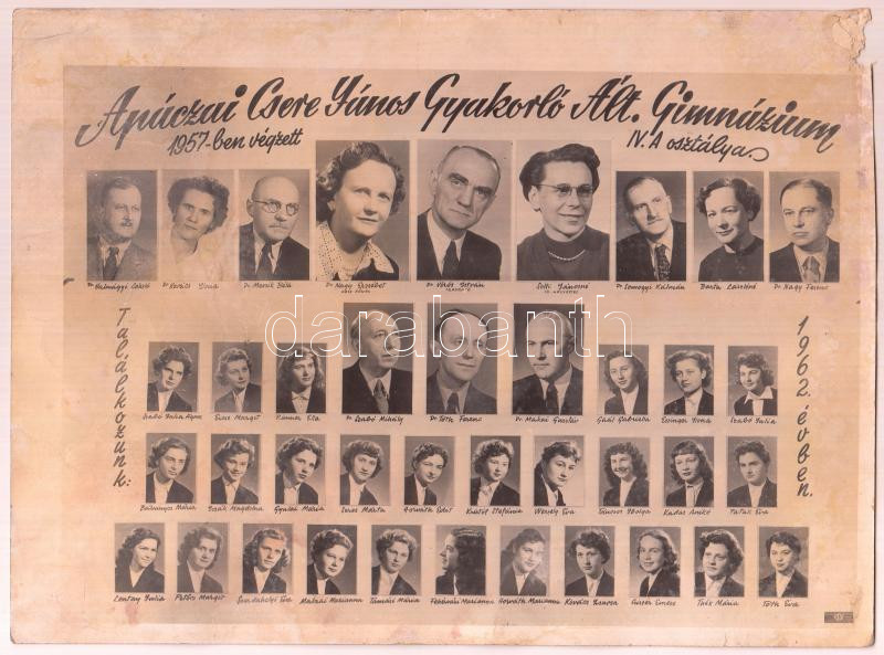 1957 Apáczai Csere János Gyakorló Ált. Gimnáziumban végzett hallgatók és tanárainak tablóképe, rajta 39 nevesített portré, kicsit megviselt állapotban, 18x24 cm.