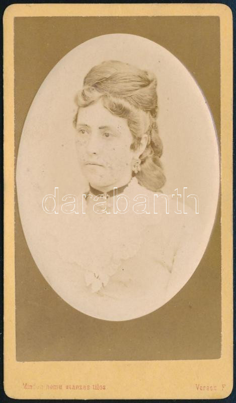Leírás: cca 1860 Holloky Gizella - Bocsánczy Rudolfné - vizitkártya méretű, feliratozott, porcelánkép utánzatú fotója, Veress Ferenc kolozsvári műterméből, 10,5 x6 cm