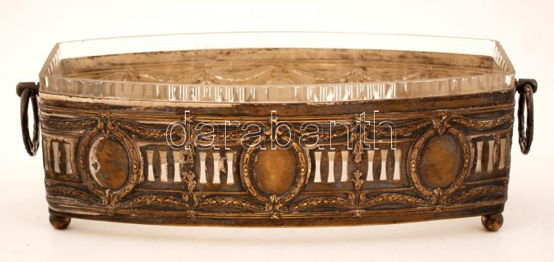 Leírás: Füles kínáló, eredeti csiszolt üvegbetéttel, apró csorbával, jelzés nélkül, rezezett fém, 29×10 cm, m:9,5 cm