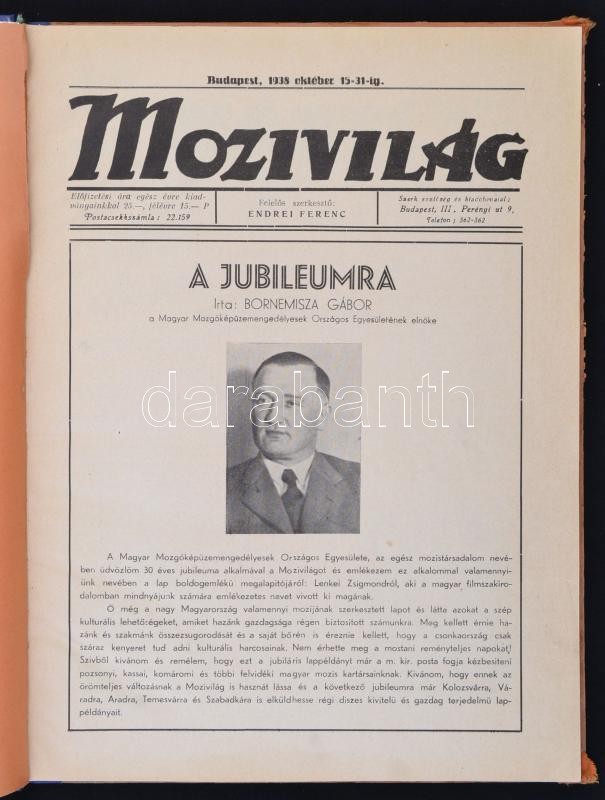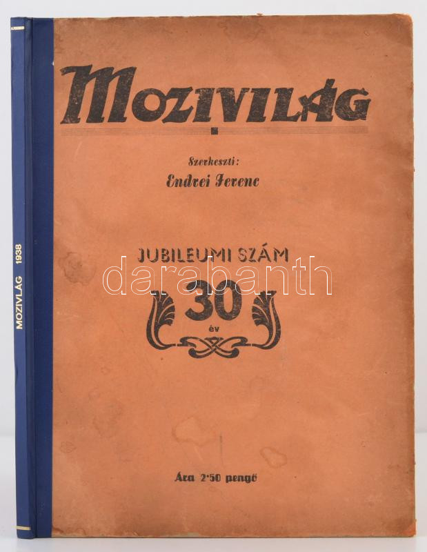 1938 Mozivilág. Jubileumi szám, Szerk.: Endrei Ferenc, Átkötött karton... https://www.darabanth.com/hu/284-Gyorsarveres/284.0/Festmeny-mutargy-papirregiseg-egyeb/Nyomtatvanyok~27/1938-Mozivilag-Jubileumi-szam-Szerk-Endrei-Ferenc-Atkotott-kartonalt-papirkotes-kissC3~II1474309