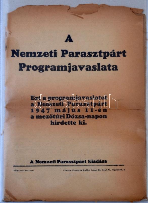 1947 A Nemzeti Parasztpárt programjavaslata, rossz állapotú nyomtatván... https://www.darabanth.com/hu/284-Gyorsarveres/284.0/Festmeny-mutargy-papirregiseg-egyeb/Nyomtatvanyok~27/1947-A-Nemzeti-Parasztpart-programjavaslata-rossz-allapotu-nyomtatvany~II1477214
