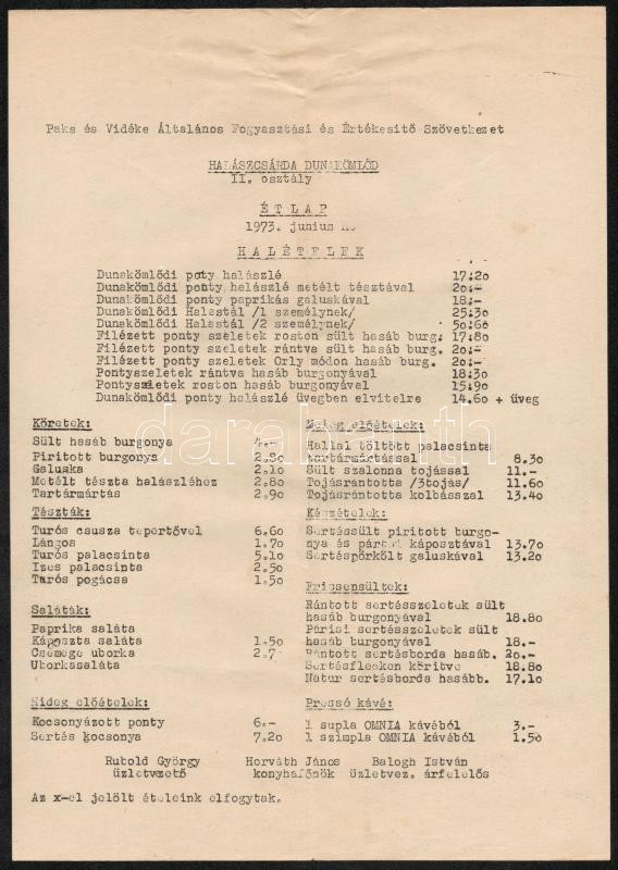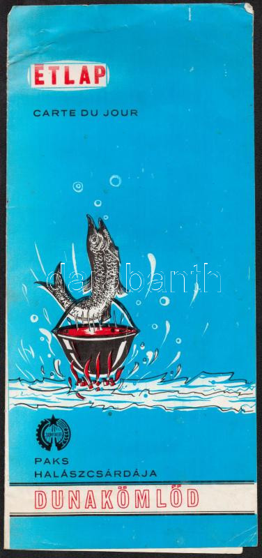 1973 Dunakömlőd, A Halászcsárda étlapja https://www.darabanth.com/hu/284-Gyorsarveres/284.0/Festmeny-mutargy-papirregiseg-egyeb/Nyomtatvanyok~27/1973-Dunakomlod-A-Halaszcsarda-etlapja~II1474928
