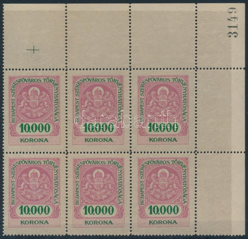 Budapest Székefőváros Törvényhatósága 10.000K ívsarki 6-os tömb https://www.darabanth.com/hu/284-Gyorsarveres/284.0/Festmeny-mutargy-papirregiseg-egyeb/Okmanybelyegek~15/Budapest-Szekefovaros-Torvenyhatosaga-10000K-ivsarki-6-os-tomb~II1476308