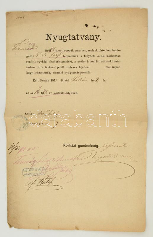 1875 Pest, Árkimutatás a sz. Rókushoz címzett pestvárosi kórházban ren... https://www.darabanth.com/hu/284-Gyorsarveres/284.0/Festmeny-mutargy-papirregiseg-egyeb/Okmanyok~16/1875-Pest-Arkimutatas-a-sz-Rokushoz-cimzett-pestvarosi-korhazban-rendezendo-temetesek-ko~II1475674