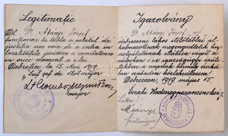 Leírás: 1919 Debrecen román megszállás alatt kiállított kétnyelvű igazolvány / Debrecen Romanian occcupation id