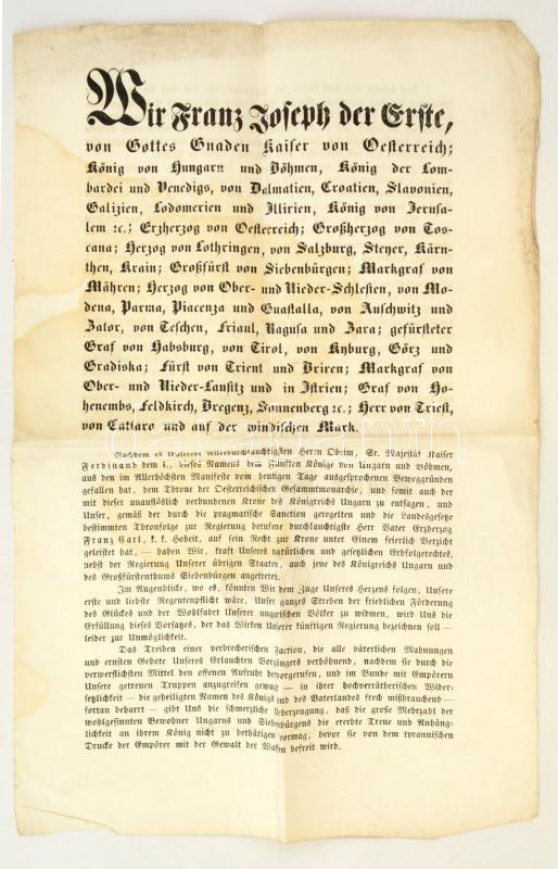 1848. december 2. I. Ferenc József olmützi proklamációja, melyben a frissen trónra lépett császár-király alkotmányos berendezkedést és liberális reformokat ígért / 1848 Proclamation of the new emperor Franz Joseph. 29x44 cm