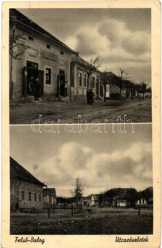 Leírás: Felsőbalog, Vámosbalog, Vysny Blh; utcarészlet, vendéglő, üzletek, özv. György Jánosné kiadása / street, restaurant, shops (EB)