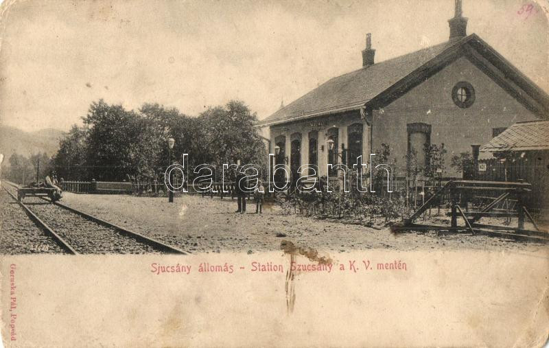 Leírás: Szucsány, Sjucsány, Sucany; vasútállomása KOV vonal mentén, hajtány a sínen. Geruska Pál kiadása / railway station, handcar (ázott / wet damage)