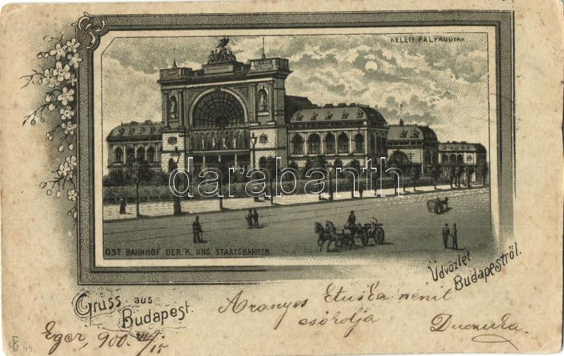 Leírás: Budapest VII. Keleti pályaudvar, floral litho (vágott / cut)