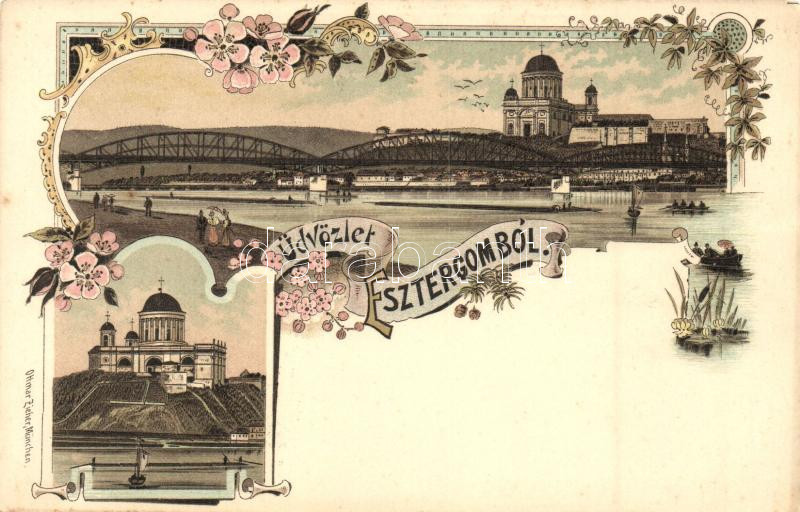Leírás: Esztergom, Bazilika, látkép, híd, Ottmar Zieher floral Art Nouveau litho