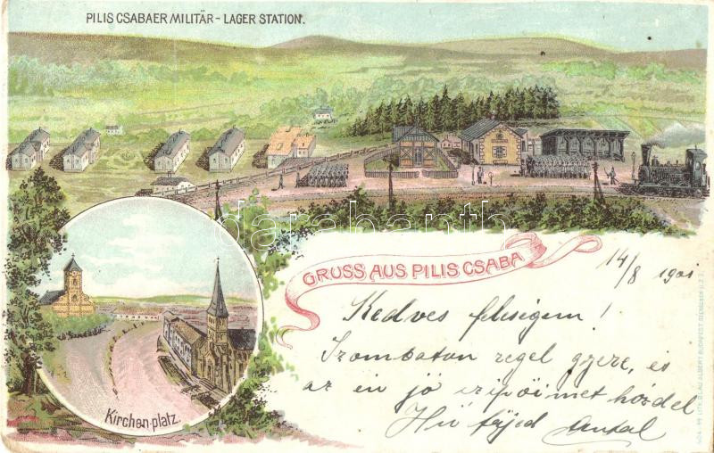 Leírás: Piliscsaba, Katonai laktanya, Templom tér / Militär-Lager Station, Kirchen-Platz. Blau Albert litho (EK)
