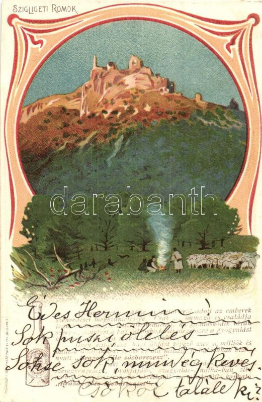 Leírás: Szigliget, Várrom, kiadja Bruchsteiner és fia, Brázay-féle sósborszesz reklámjával. Art Nouveau litho