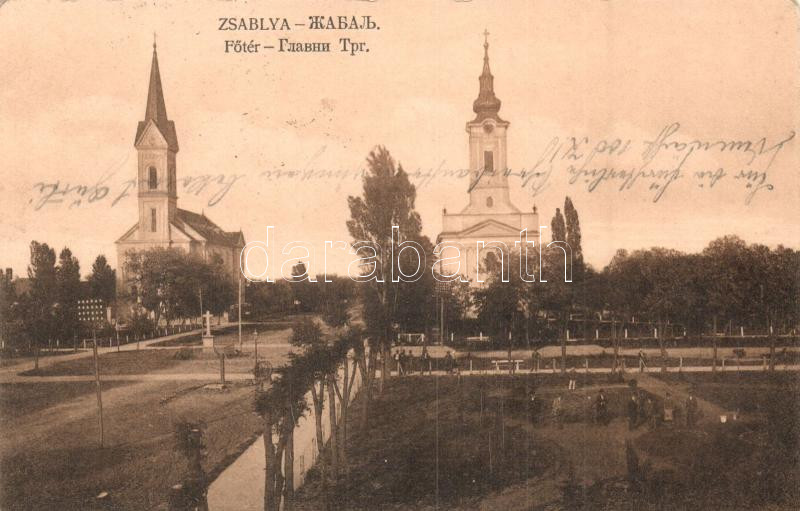 Zsablya, Zsabja, Zabalj; Fő tér, kiadja Karapancsity W. / main square https://www.darabanth.com/hu/284-Gyorsarveres/284.0/Kepeslapok/Vajdasag~200010/Zsablya-Zsabja-Zabalj-Fo-ter-kiadja-Karapancsity-W-main-square~II1481134