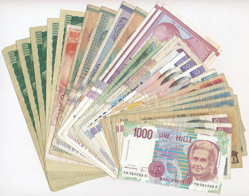 Vegyes: 31db-os papírpénz tétel, európai országok csehszlovák, román, szlovén és spanyol bankjegyek T:III