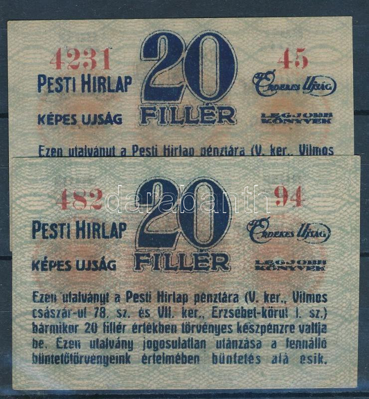 Budapest 1920. 20f (2x) kék illetve fekete betűs változatok, hajtatlan... https://www.darabanth.com/hu/284-Gyorsarveres/284.0/Numizmatika/Magyar-es-kulfoldi-papir-es-fem-szuksegpenzek~400006/Budapest-1920-20f-2x-kek-illetve-fekete-betus-valtozatok-hajtatlanok-a-fekete-betuson-szam~II1478301