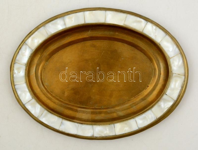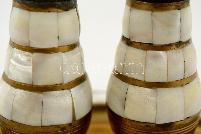 Leírás: Gyöngyház berakásos réz só-bors szóró tálcával, m:11 cm (2×), 18×13 cm