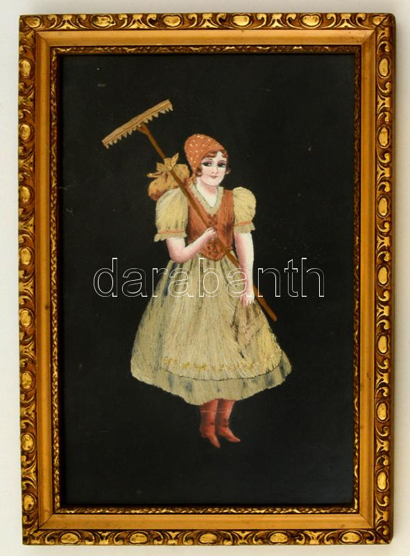 Leírás: Parasztlány gereblyével régi tűgobelin üvegezett keretben 30x50 cm