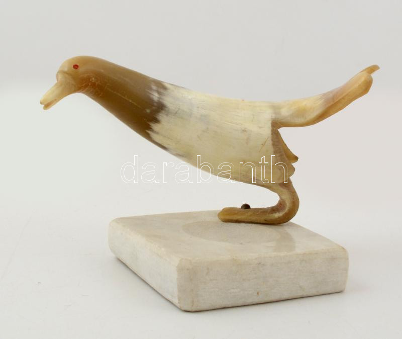 Leírás: Szaruból készült madár figura, műkő talapzattal, m:10 cm, h:17 cm