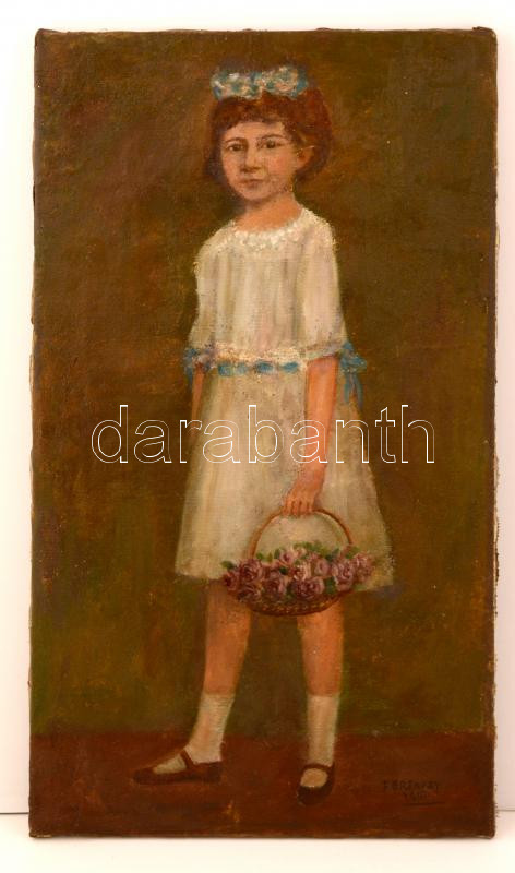 Leírás: Ferenczy jelzéssel: Kislány virágkosárral. Olaj, vászon, 64×36 cm