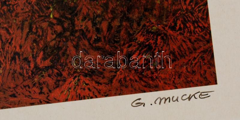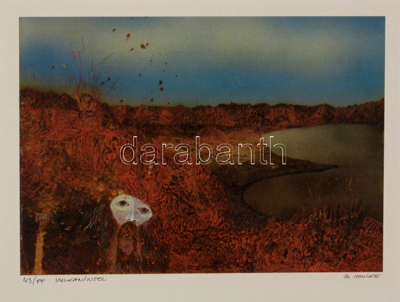 Günter Mucke (?-): Vulkaninsel. Szitanyomat, papír, jelzett, 20×29 cm https://www.darabanth.com/hu/285-Gyorsarveres/285.0/Festmeny-mutargy-papirregiseg-egyeb/Festmenyek-es-grafikak~100001/Gunter-Mucke--Vulkaninsel-Szitanyomat-papir-jelzett-20C39729-cm~II1466070