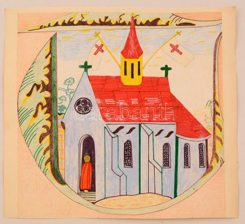 K jelzéssel: Sárga tornyú templom. Filc-színes ceruza, papír, 33×33 cm https://www.darabanth.com/hu/285-Gyorsarveres/285.0/Festmeny-mutargy-papirregiseg-egyeb/Festmenyek-es-grafikak~100001/K-jelzessel-Sarga-tornyu-templom-Filc-szines-ceruza-papir-33C39733-cm~II1392164