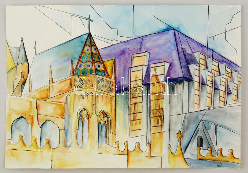 Leírás: Kun Sarolta (1990-): Mátyás templom. Akvarell-tus, papír, jelzett, 38×55 cm