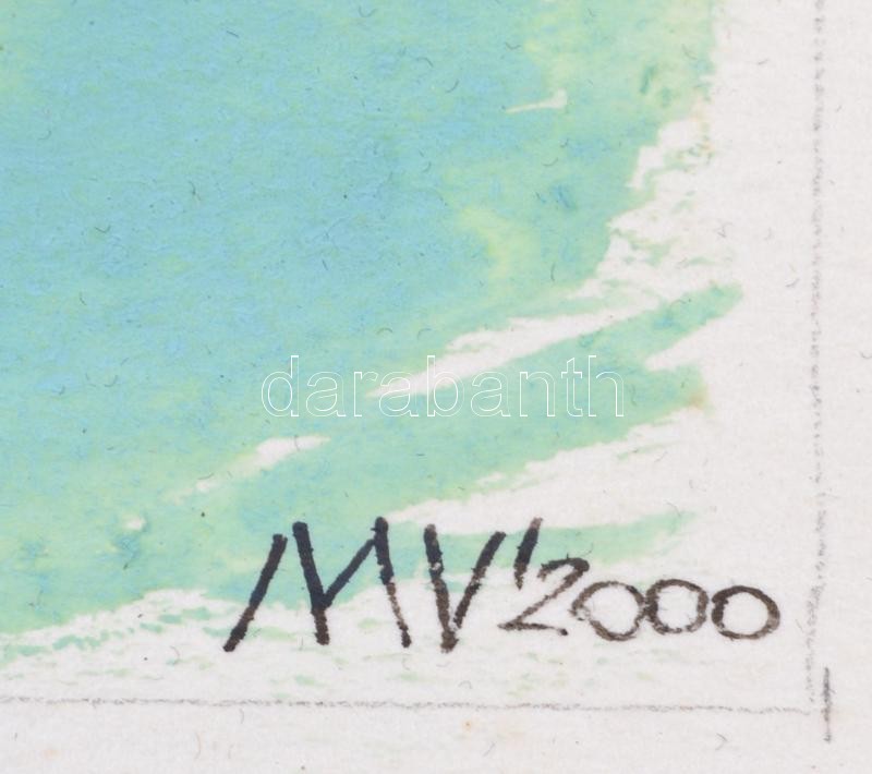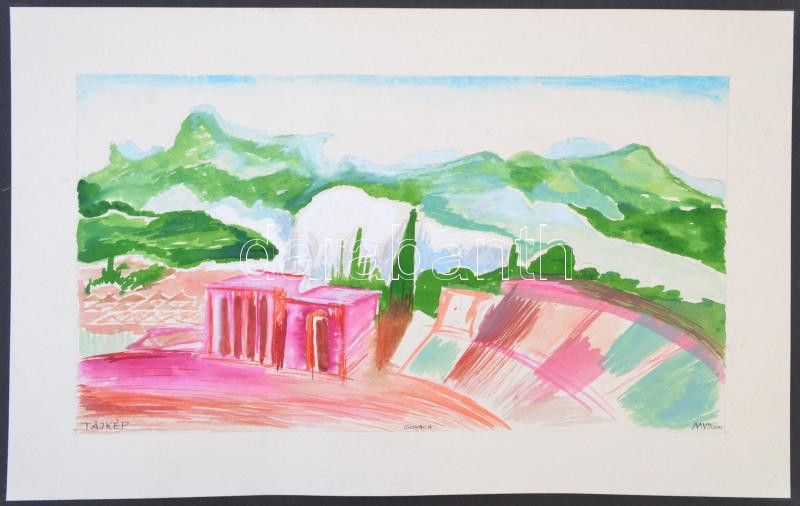 Leírás: Merényi Valéria (1955-): Tájkép. Gouache, papír, jelzett, 21×40 cm