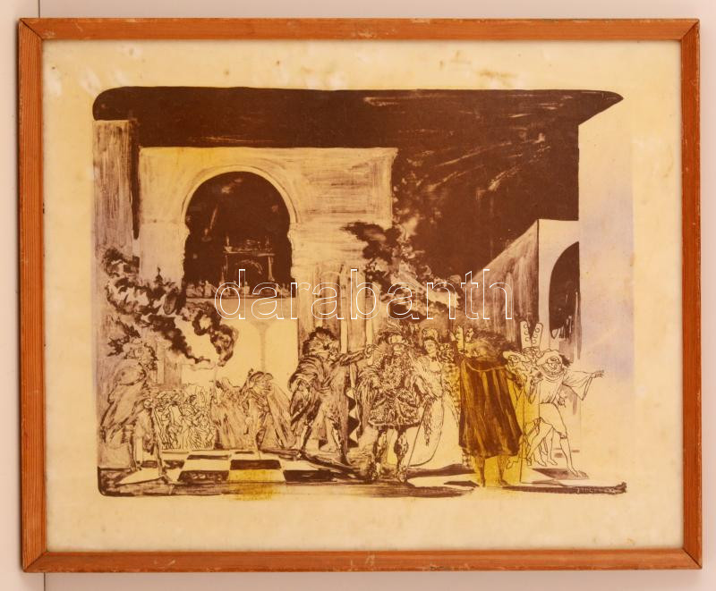 Leírás: Olvashatatlan jelzéssel: Színpadi jelenet. Litográfia, papír, foltos, üvegezett keretben, 34×44 cm