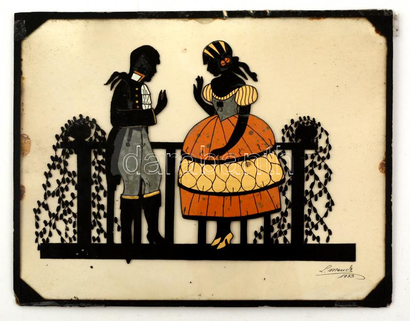 Leírás: Olvashatatlan jelzéssel: Udvarlás. Sziluett kép, kollázs, papír, üvegezett, apró hibákkal, 23×29 cm