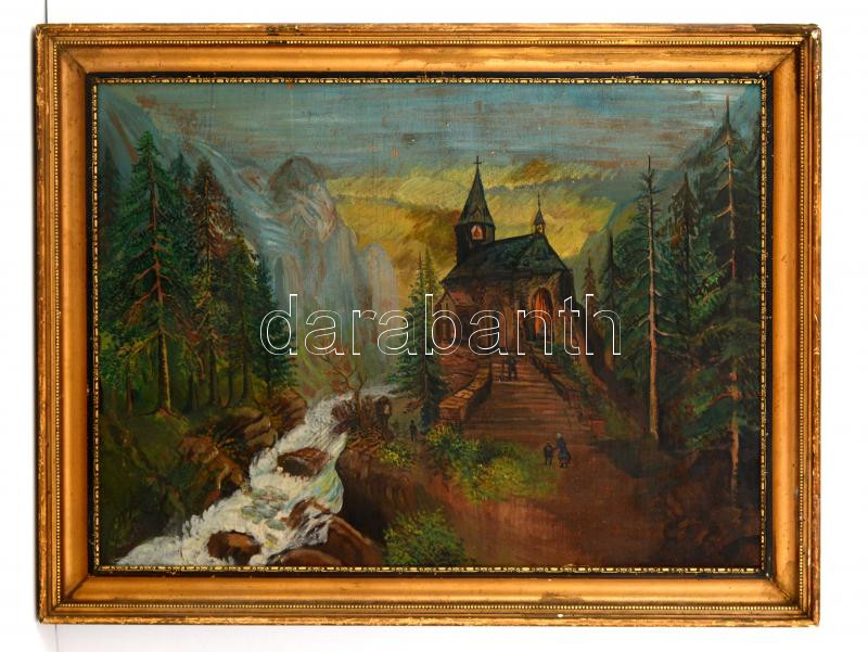 Leírás: Pahner jelzéssel: Templom a patak partnál. Olaj, karton, keretben, 55×75 cm