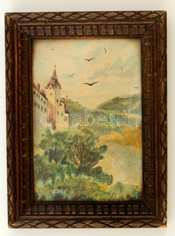 Leírás: Paula jelzéssel: Kastély. Akvarell, papír, üvegezett keretben, 13×10 cm
