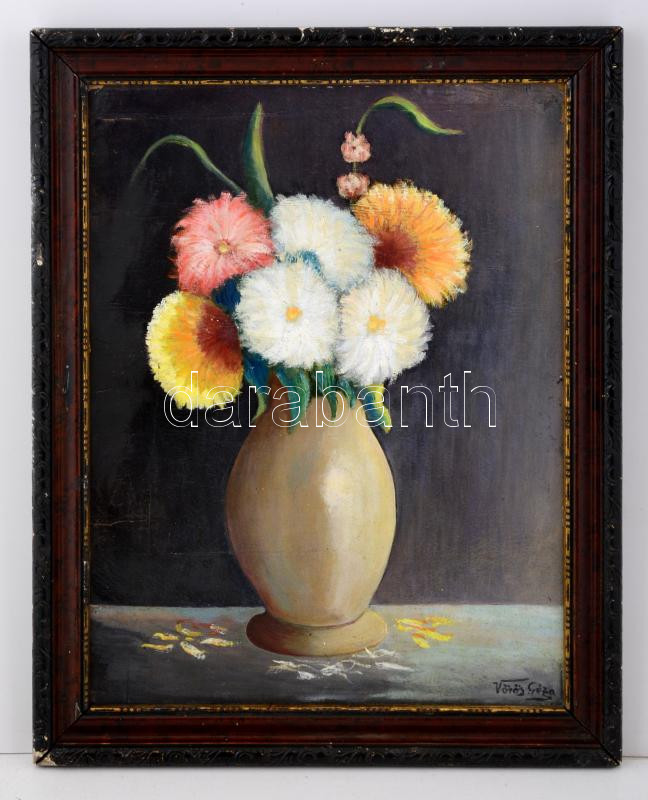 Vörös jelzéssel: Virágcsendélet. Olaj, karton, sérült, 44×33 cm https://www.darabanth.com/hu/285-Gyorsarveres/285.0/Festmeny-mutargy-papirregiseg-egyeb/Festmenyek-es-grafikak~100001/Voros-jelzessel-Viragcsendelet-Olaj-karton-serult-44C39733-cm~II1490626