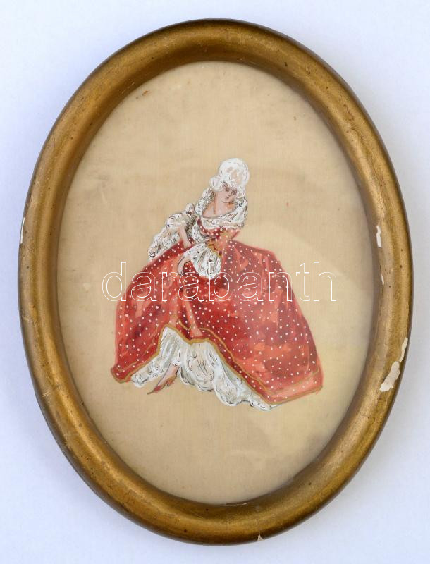 Leírás: XIX. sz: Selyemre festett akvarell, jelzés nélkül. Üvegezett keretben. 22x14 cm