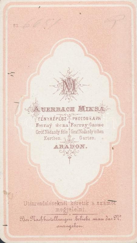 Leírás: 1868 Reichel Irma műtermi fotója vizitkártya méretben, Auerbach Miksa aradi műterméből, 10x6 cm