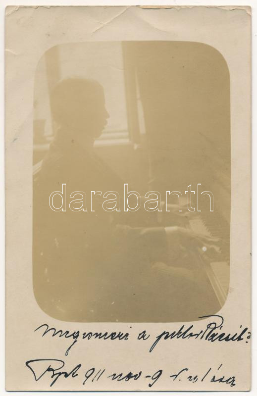 Leírás: 1911 Budapest, Beliczay Gyula festőművész a zongoránál, a képeslapként elküldött fotón saját kézzel írt szöveg