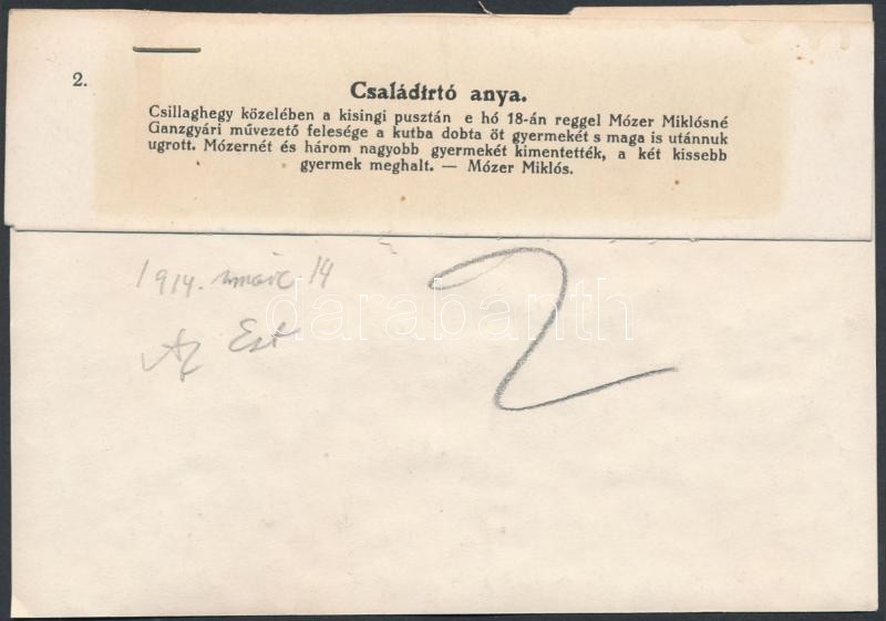 Leírás: 1914 A családírtó anya. Csillaghegy mellett a kisingi pusztán. Az Est sajtófotója. hozzátűzött felirattal 17x11 cm