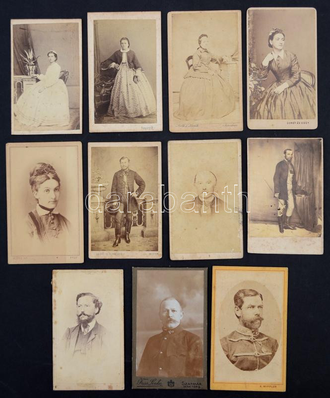 cca 1860-1900 11 db magyar keményhátú fotó (Licskó és Schneider (Pest), Strelisky L. (Pest), Tömöry Ferenc, Klösz György (Pest), A. Wippler (Herkulesfürdő), Friss Lenke (Szatmár), Gondy és Egey (Debrecen), Roth és Lovich (Kassa)), változó állapotban, 6x10 cm.