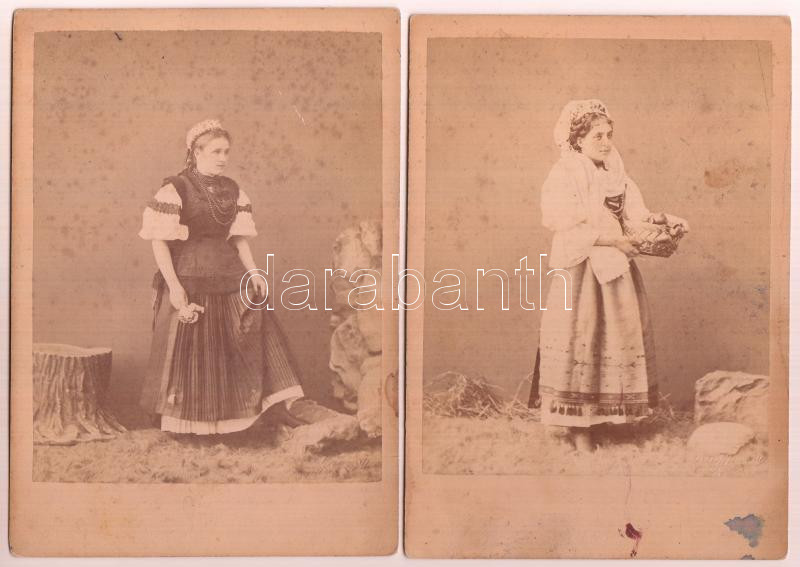 Leírás: cca 1883 Egy kalotaszegi és egy oláh lányról készült keményhátú műtermi fotó, 2 db, hátoldalon feliratozva, egyiken foltokkal, 15,5x11,5 cm