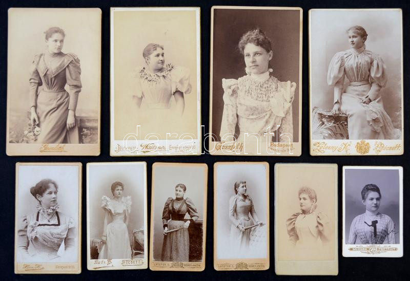 cca 1890-1900 Női portrék, 10 db (Zelesny Károly (Pécs), Letzer J. (Kassa), Goszleth István (Budapest), Waitzner (Budapest), Herz H. (Budapest), Kifs József (Eger), Pats H. (Pécs), Mignon Portrait), egy részükön felirat, írás, változó méretben, jó állapotban.