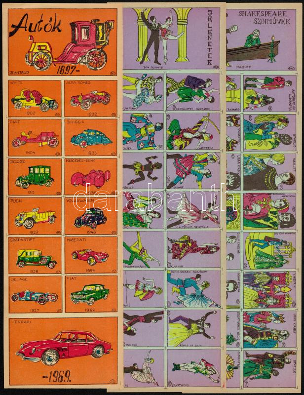 Leírás: 3 db vágatlan ív különböző motívumokkal: balett, autó, Shakespeare