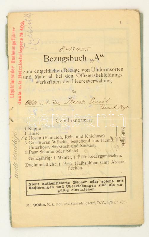 1918 Osztrák-magyar vasúti tiszt ruhakönyve / Eisenbahnregiment Bezugsbuch zum entgeltlichen Bezuge von Uniformsorten und Material bei den Offiziersbekleidungswerkstätten der Heeresverwaltung