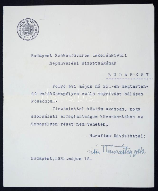 Leírás: 1931 A Honvédség főparancsnokának, vitéz Kárpáthy Kamillónak saját kézzel aláírt levele