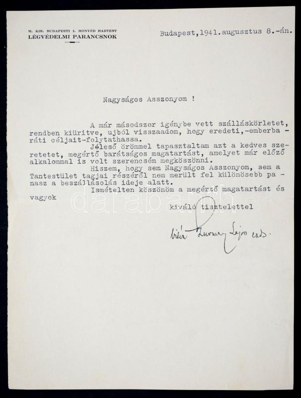Leírás: 1941 Vitér Szurmay Lajos ezredes saját kézzel aláírt levele