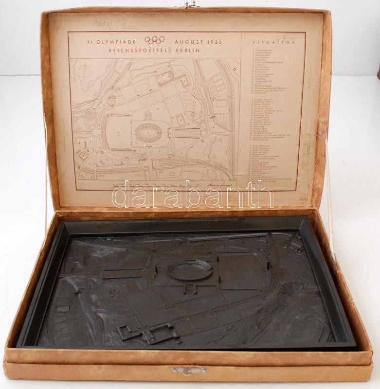Az 1936-os berlini olimpia létesítményeinek korabeli, eredeti makettje, bakelit, jelmagyarázatokkal ellátott eredeti dobozban, hibátlan, 21x29cm / The mock-up of the Olympics edifice of Berlin in 1936, vinyl, in original box, in good condition, 21x29cm