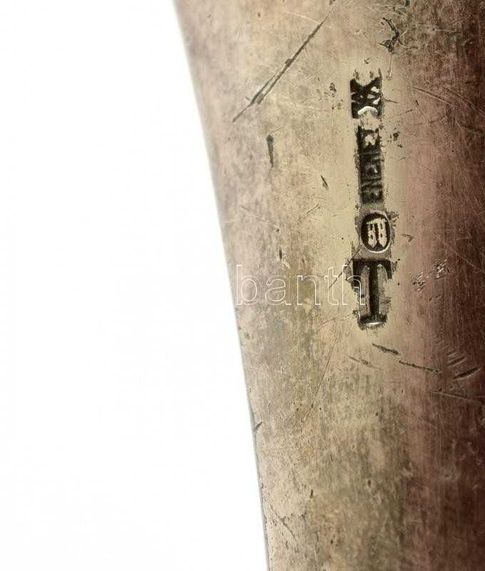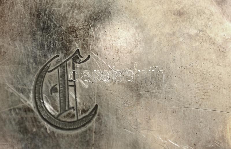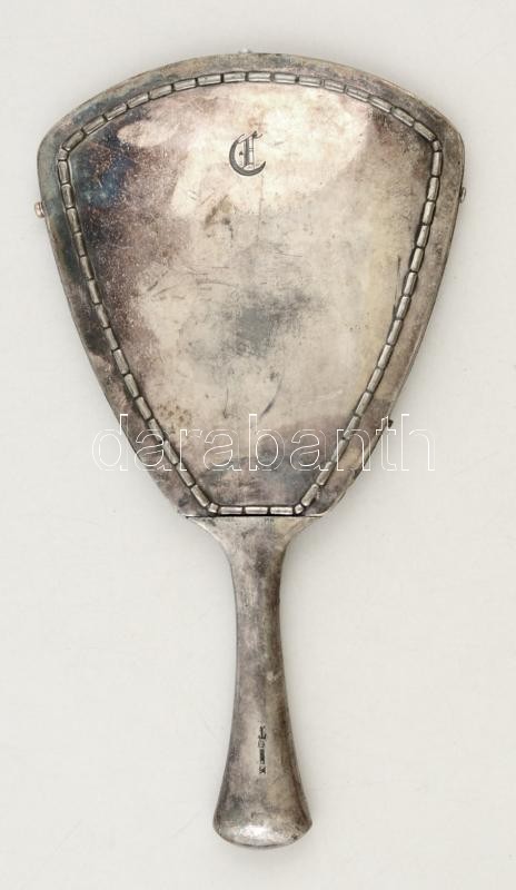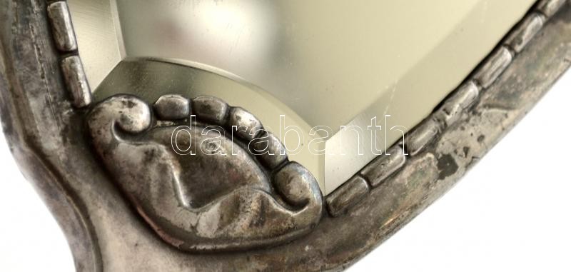 Leírás: Ezüstözött kézi, csiszolt tükör, pótolt csavarokkal, monogrammal, jelzett, kopott, 25×13 cm