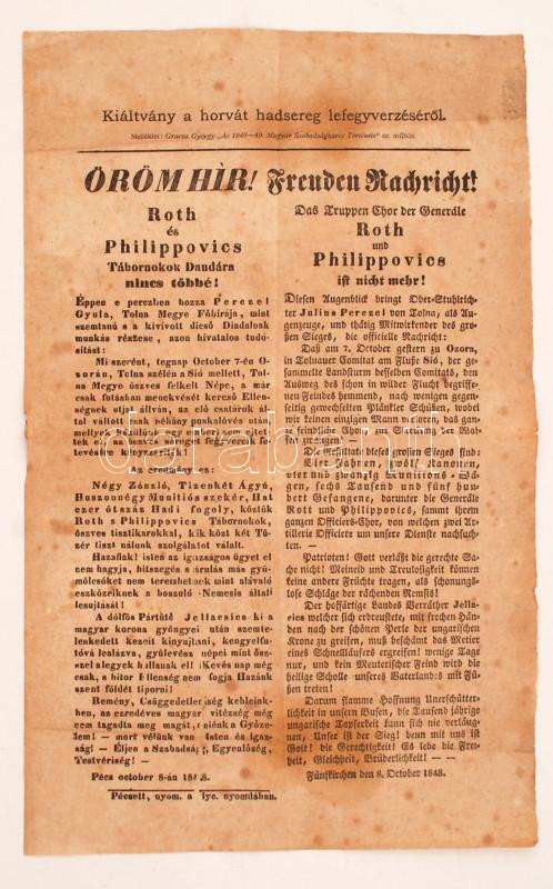Leírás: 1895 Kiáltvány a horváth hadsereg lefegyverzéséről, Melléklet: Gracza György Szabadságharcz történetéhez, magyar ill., német nyelven, 40x25cm