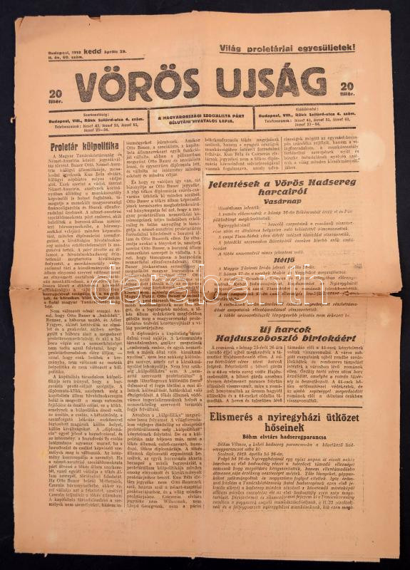 1919 A Vörös Újság április 29. száma a Tanácsköztársaság híreivel. https://www.darabanth.com/hu/285-Gyorsarveres/285.0/Festmeny-mutargy-papirregiseg-egyeb/Nyomtatvanyok~100027/1919-A-Voros-Ujsag-aprilis-29-szama-a-Tanacskoztarsasag-hireivel~II1493911
